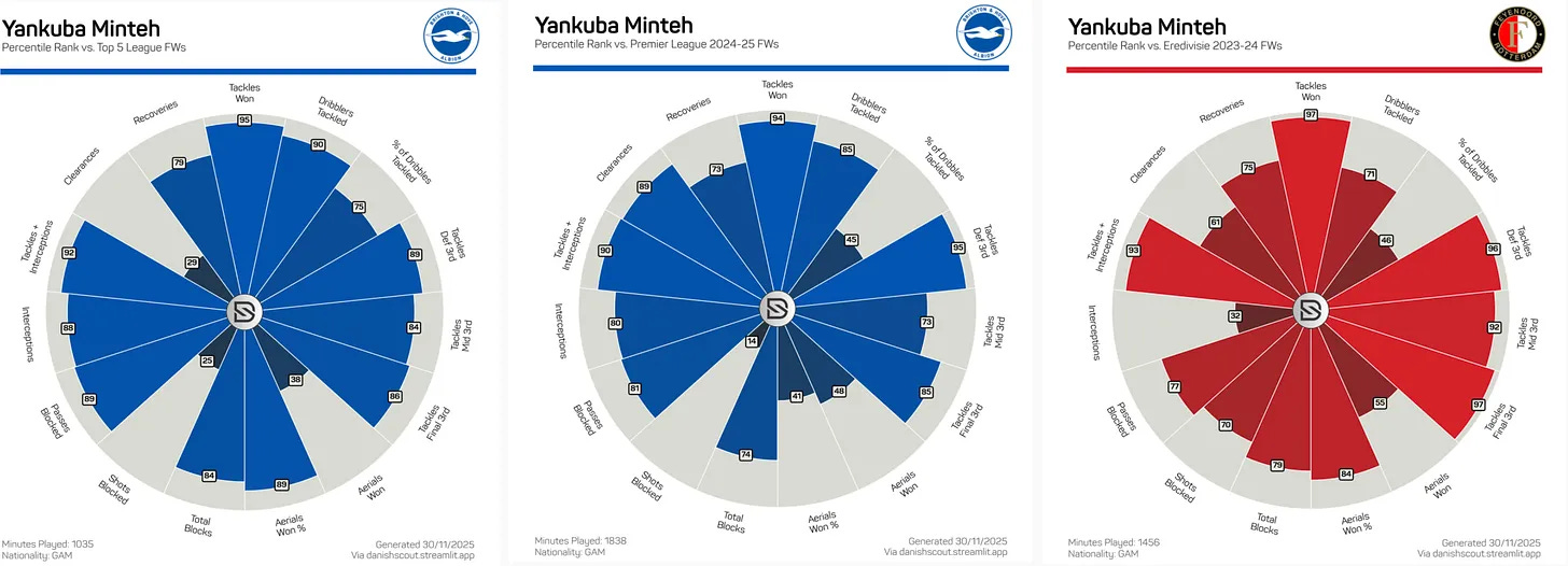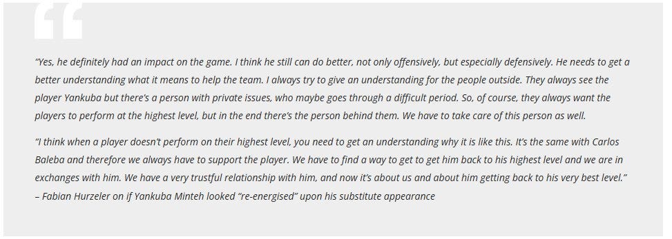— Commenting on the “personal issues” would be overly speculative, so there’s no point in doing so. What I will say is that Hürzeler afforded Baleba a LOT of chances (even though they ended in 45-minute subs) and, assuming nothing’s fundamentally wrong with Minteh, he should continue doing the same. Even if the reasons for the personal issues are wildly different, the broad[er] framework is the same, and I think is less damning for xMins than, say, a tactical mismatch (back 5, lethargic pressing).