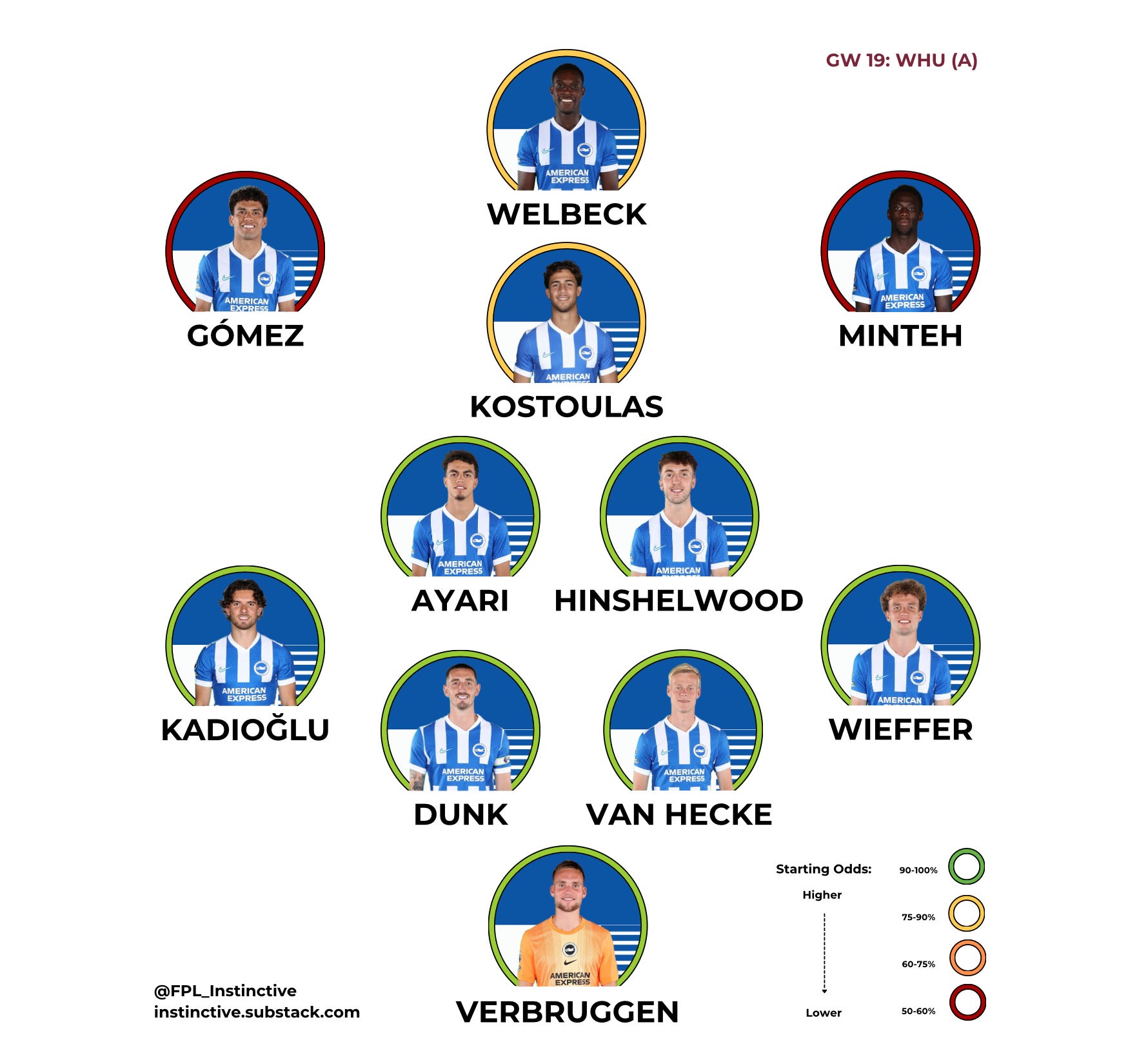 There’s also a rumour going around that Kostoulas starts, which would further reduce Minteh’s xMins (but primarily hurt Welbeck and Georginio). Kostoulas has come on for Minteh before, and while he’s mainly played as a CF/AM over his career, he’s picked up minutes at RW [positions] for Brighton.